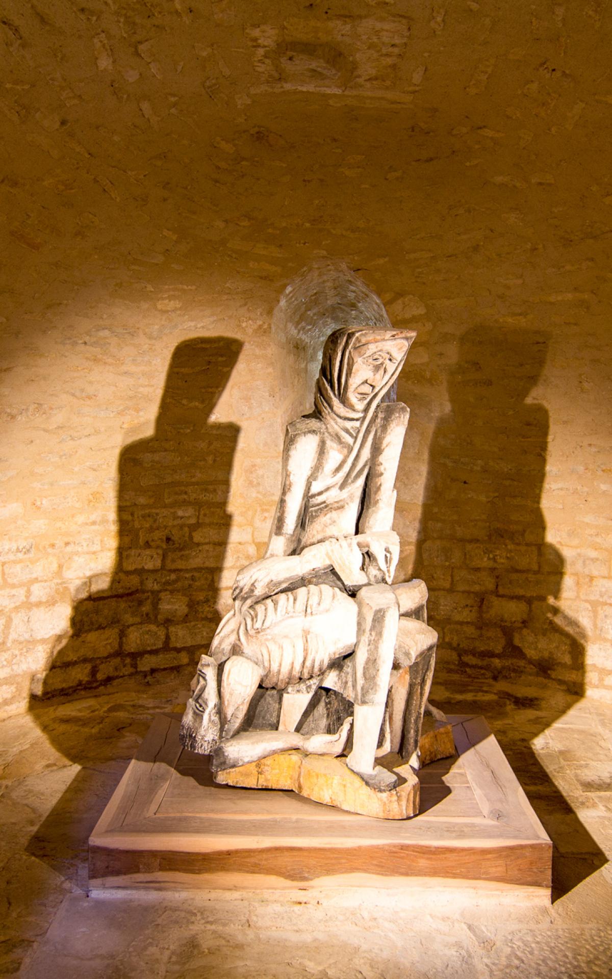 Le chœur d’une église est l’espace sacré situé à l’est de la nef, réservé au clergé et au célébrant. Il abrite l’autel, centre liturgique où se célèbre l’eucharistie, et symbolise la présence divine. Dans l’église Saint-Laurent des Arques, ce chœur roman du XIIᵉ siècle illustre cette fonction spirituelle par une architecture sobre et équilibrée. L’abside semi-circulaire, voûtée en cul-de-four, est ornée d’arcatures en plein cintre reposant sur des colonnettes aux chapiteaux sculptés, typiques de l’art roman du Lot. Une crypte rectangulaire s’étend sous le sanctuaire, accentuant la verticalité du lieu et son lien avec le sacré. Le décor mêle influences romanes et mozarabes, avec des motifs géométriques et torsadés évoquant la recherche d’harmonie entre terre et ciel. Ce chœur, par sa structure et sa symbolique, exprime à la fois la simplicité monastique et la profondeur spirituelle propre à l’art religieux du sud-ouest médiéval.